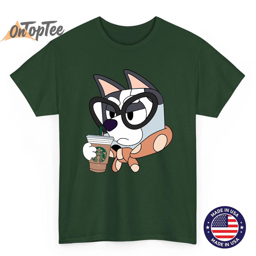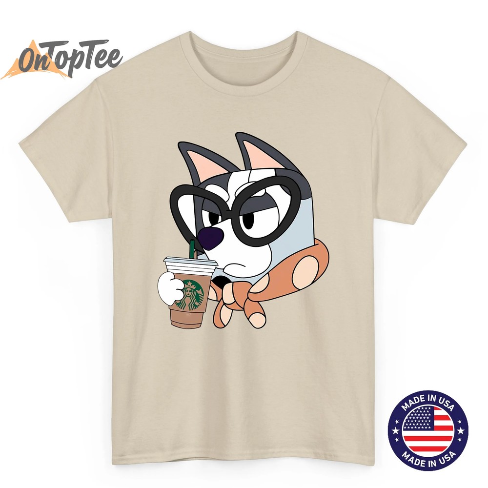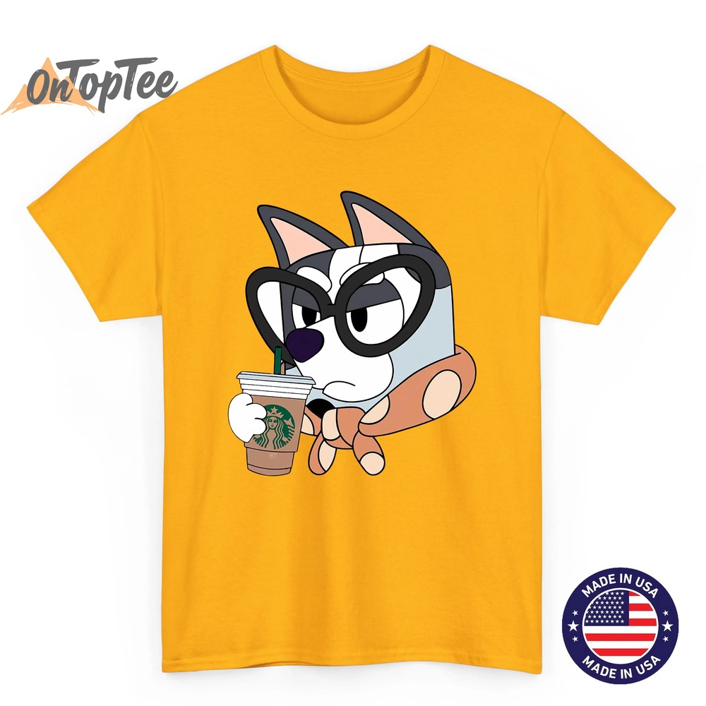 This T-shirt’s eye-catching graphic features a whimsical depiction of Bluey, combined with humorous elements referencing muffins, grannies, and coffee — creating a quirky, relatable, and fun design. The vibrant colors and detailed print stand out, making this a conversation starter among fellow coffee enthusiasts and fans of funny, eye-catching apparel.