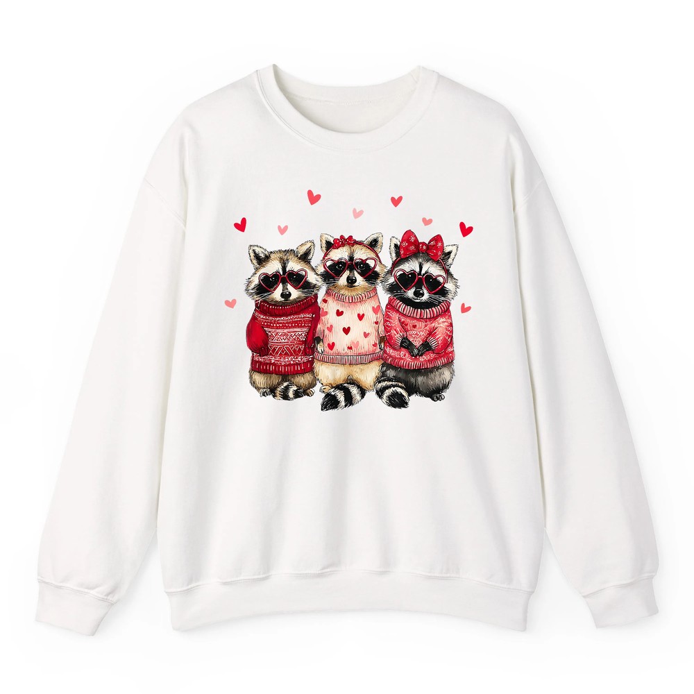 Centered on the sweatshirt is an adorable raccoon illustration, accented with a love heart, symbolizing feral wildness and lovely innocence. The playful design captures the essence of youthful charm and love-themed festivities.